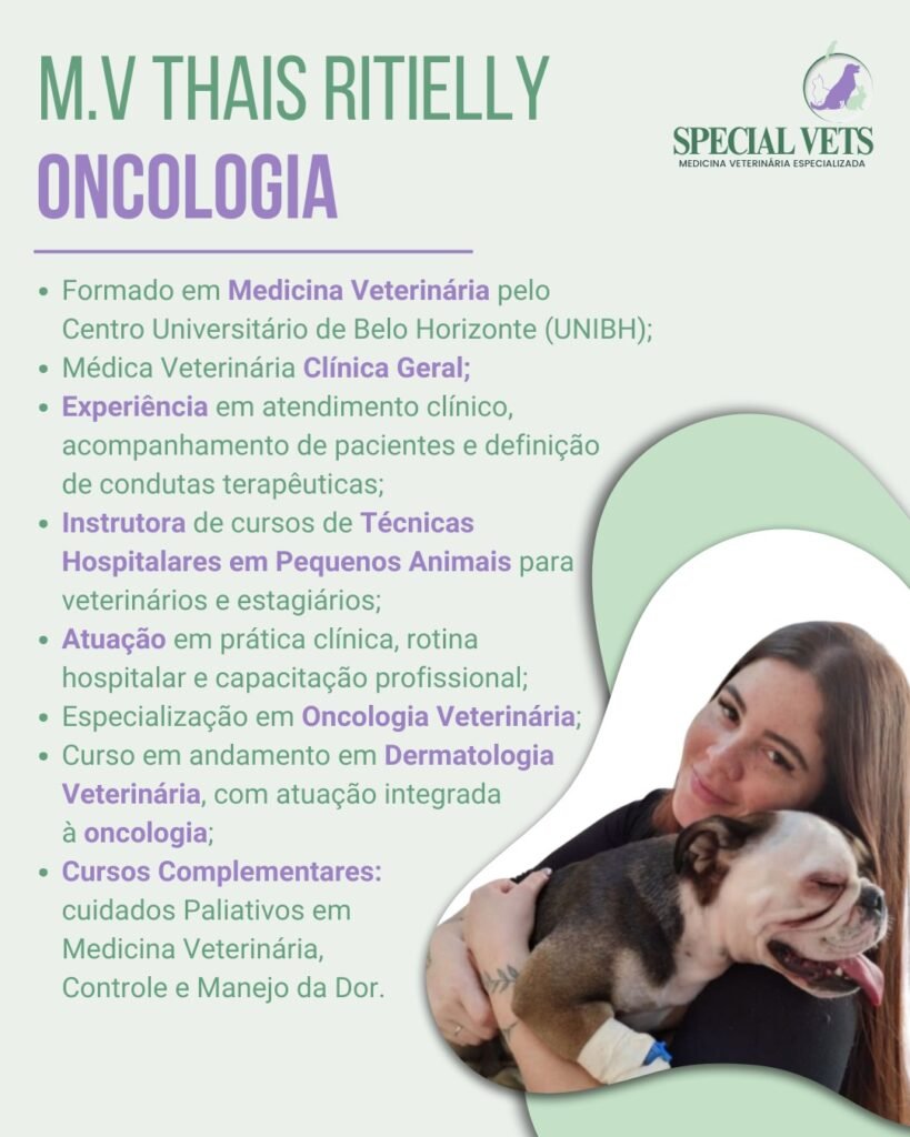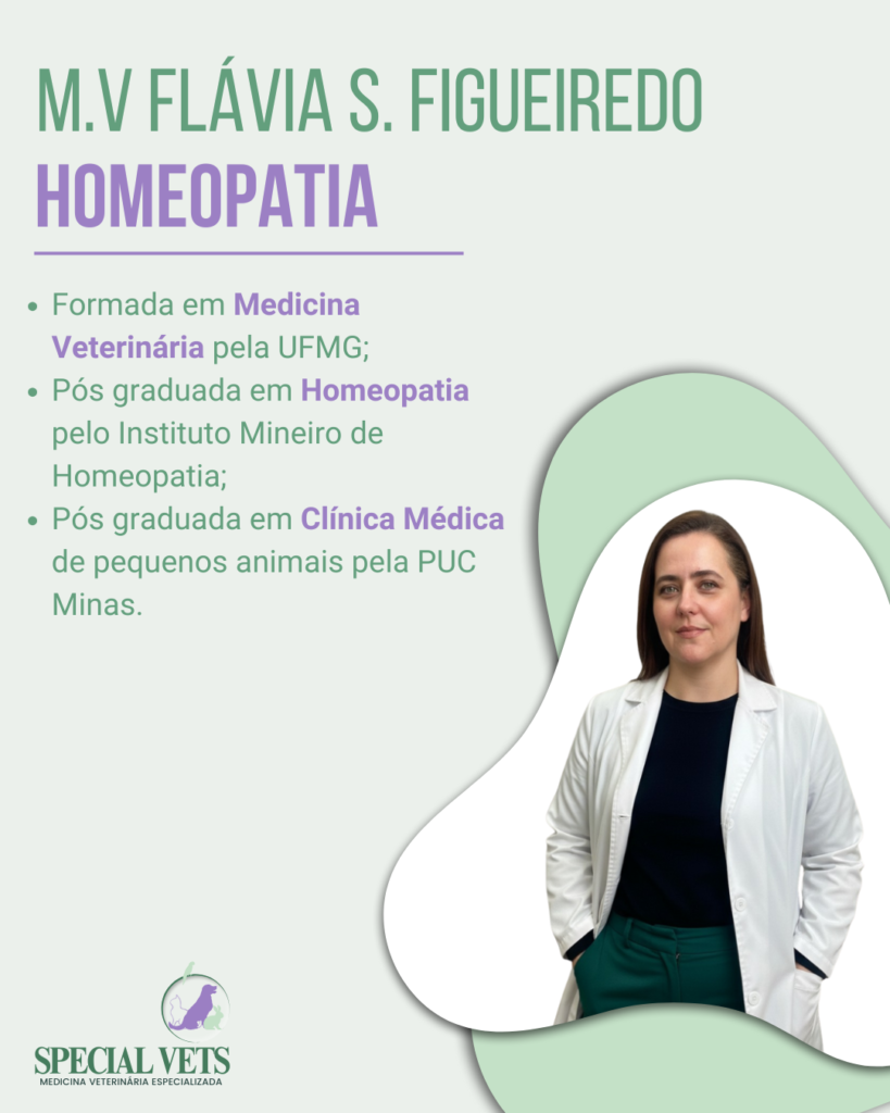 A Dra. Flávia é Médica Veterinária formada na UFMG, com especialização em clínica geral e homeopatia. Possui vasta experiência em clínica médica de pequenos animais, com foco em atendimento humanizado.